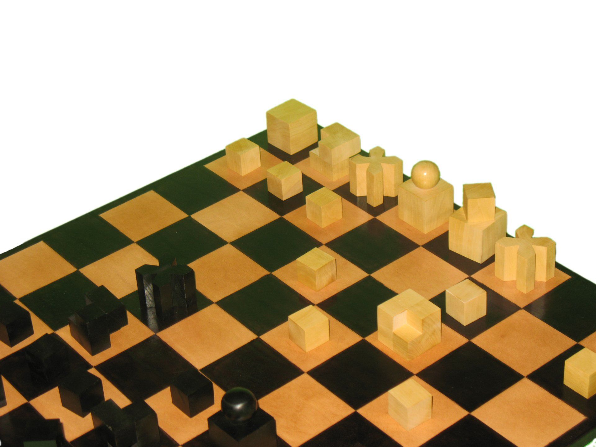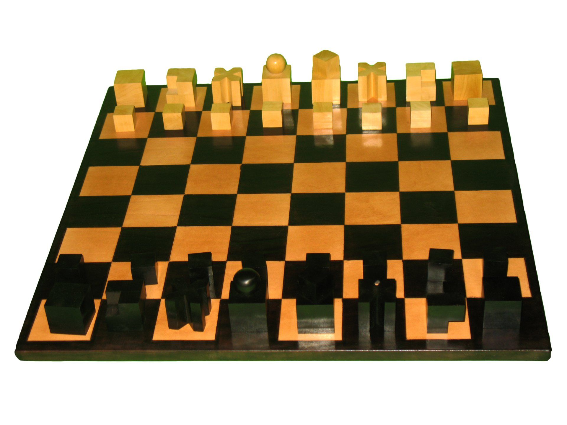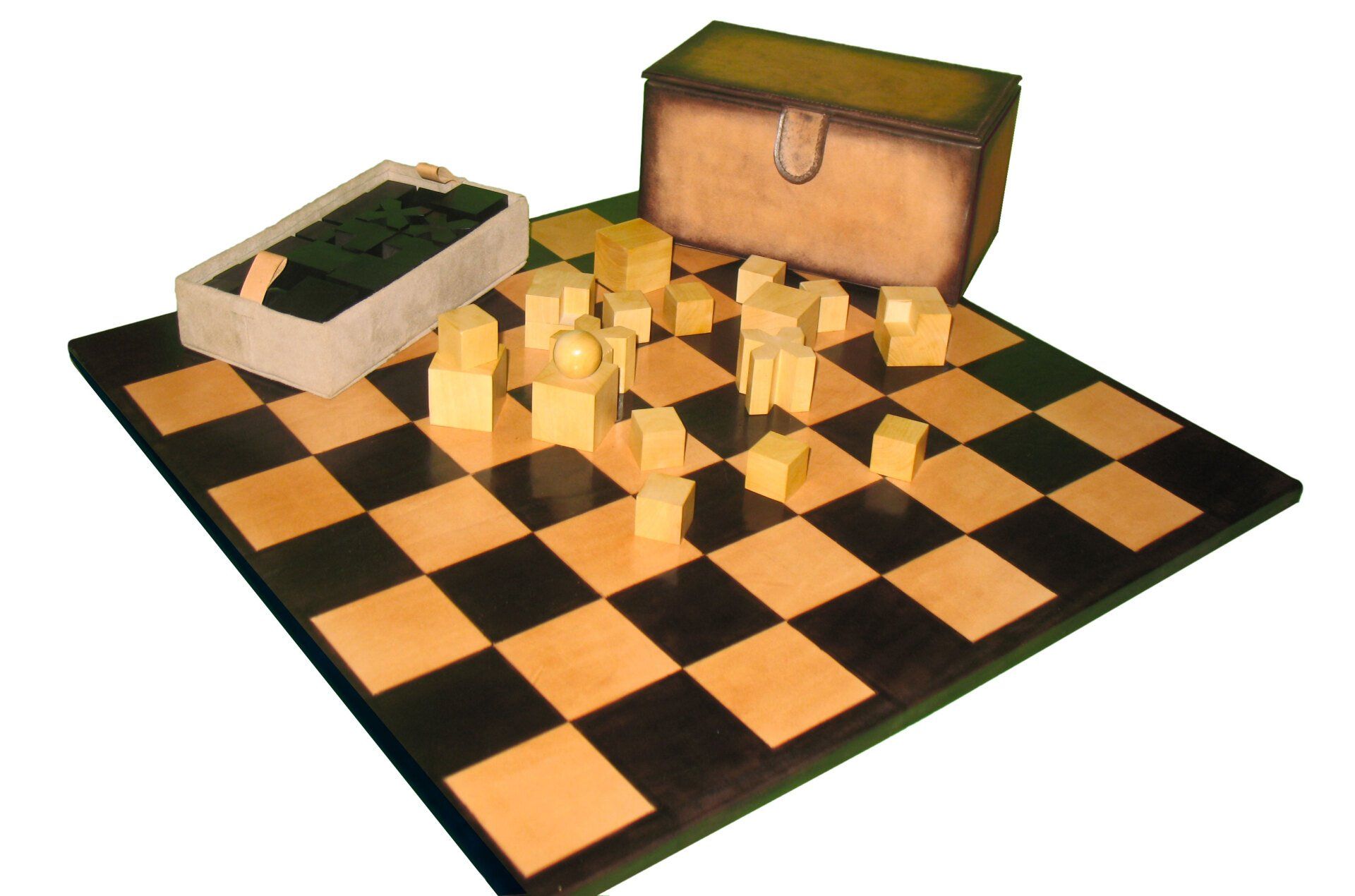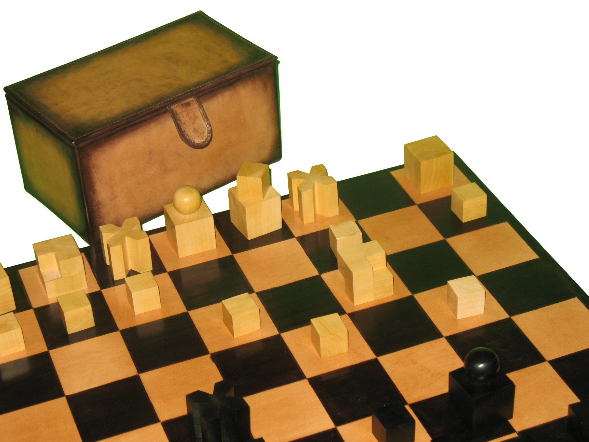 Bauhaus en 1924 par Joseph Hartwig sont fascinantes. chaque pièce a la forme de son déplacement. La fabrication du plateau et du coffret recevant les pièces est réalisée avec du cuir à tannage végétal patiné artisanalement. Le soin et le respect des matériaux aboutissent à un ensemble unique, fait sur mesure.